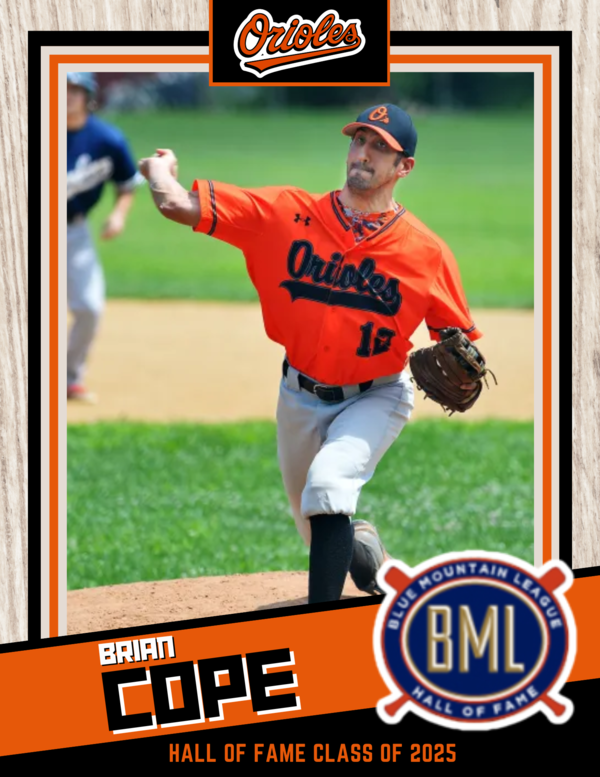 The Jordan AC Orioles proudly congratulate Brian Cope on his induction into the Blue Mountain League Hall of Fame. A graduate of Parkland High School and Lafayette College, Brian was a dominant force on the mound throughout his 11-year career with the Orioles. A four-time All-Star (2006, 2008, 2009, 2013) and the 2015 BML Pitcher of the Year, Brian’s excellence was unmatched. That same year, he also earned the prestigious Turoscy Formula Award, recognizing his outstanding all-around performance. Cope was instrumental in guiding the Orioles to BML Finals appearances in 2006, 2010, and 2011, and capped off his remarkable career as part of the 2023 Championship roster. With a career 3.04 ERA317 strikeouts, and a 34–16 record over 356.1 innings pitched, Brian’s consistency, leadership, and competitive spirit have left a lasting legacy within the Orioles organization and the entire Blue Mountain League community.